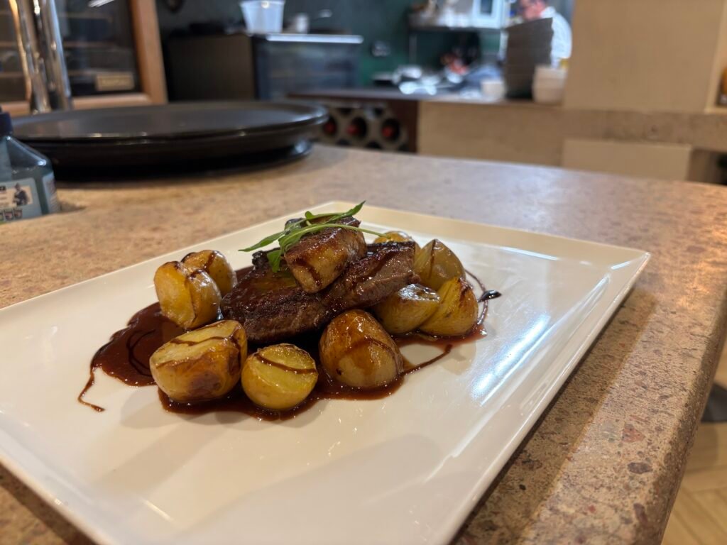 En plat principal, les convives découvriront un filet de bœuf tendre, parfaitement cuit, accompagné d’un foie gras poêlé d’une grande finesse.