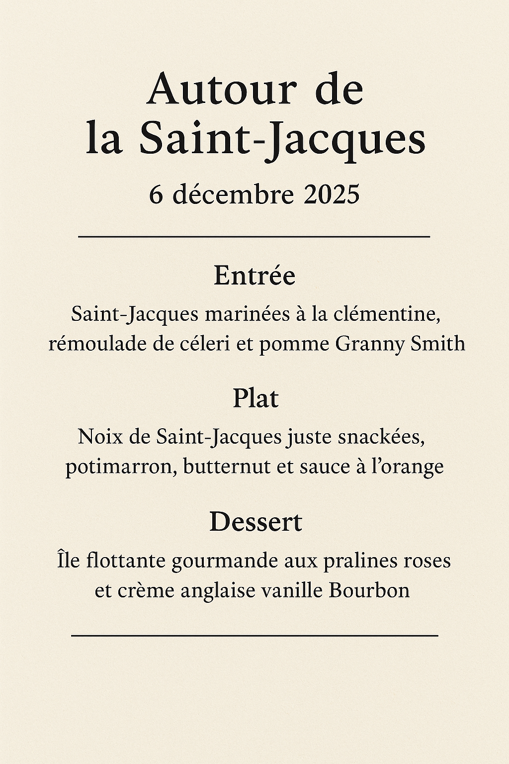 Pour cette soirée gastronomique, le chef a imaginé un menu en trois services, élégant et parfaitement équilibré, où la Saint-Jacques est la grande vedette.