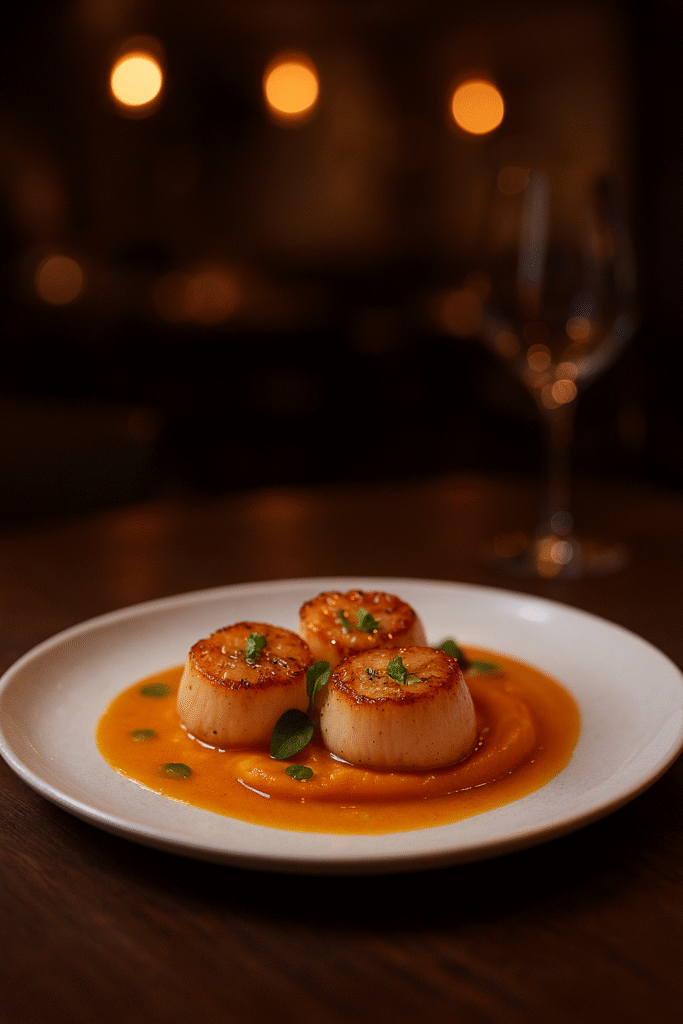 En plat principal, découvrez des noix de Saint-Jacques juste snackées, parfaitement nacrées et sublimées par une cuisson précise.