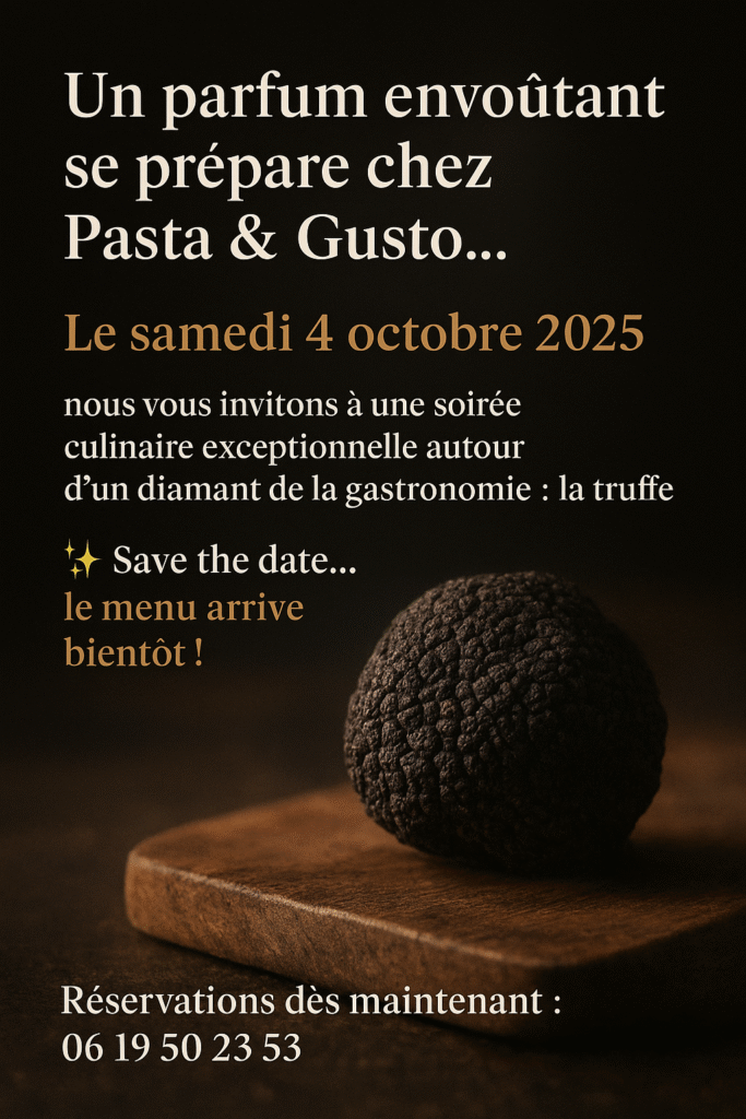 – Restaurant italien à Ajaccio – Pasta & Gusto 4 octobre 2025 : Soirée culinaire exceptionnelle chez Pasta & Gusto, restaurant italien à Ajaccio Le 4 octobre 2025, Pasta & Gusto Ajaccio organise une soirée gastronomique d’exception dédiée à la truffe et aux saveurs italiennes revisitées. Réputé comme l’un des meilleurs restaurants italiens à Ajaccio, Pasta & Gusto Ajaccio vous invite à vivre une expérience culinaire rare, mêlant raffinement, créativité et produits d’exception. Un événement gastronomique incontournable à Ajaccio Événement majeur de la rentrée, cette soirée du 4 octobre 2025 a été pensée comme un voyage gustatif, où les techniques modernes rencontrent le savoir-faire italien. Pour les amateurs de haute cuisine, c’est l’occasion idéale de découvrir ou redécouvrir Pasta & Gusto, restaurant italien à Ajaccio connu pour son exigence et sa passion du goût Un menu d’exception entièrement dédié à la truffe Au cœur de cette soirée gastronomique, un menu élaboré autour de la truffe met en lumière la maîtrise du chef et la richesse des produits sélectionnés. Entrée : Œuf parfait, crémeux parmesan, champignons et émulsion à la truffe Le dîner commence avec un œuf parfait à la texture soyeuse, posé sur un crémeux de parmesan, accompagné de champignons délicatement poêlés et relevé par une émulsion à la truffe. Un accord subtil et élégant, signature de Pasta & Gusto Ajaccio. Plat : Filet mignon de veau rôti, jus corsé à la truffe, mousseline de céleri et légumes glacés En plat principal, le chef propose un filet mignon de veau rôti, accompagné d’un jus corsé à la truffe, d’une mousseline de céleri onctueuse et de légumes glacés. Un plat généreux, équilibré et profondément parfumé. Dessert : Mousse au chocolat grand cru à la truffe, noisettes caramélisées et tuile craquante Pour terminer ce repas d’exception, une audacieuse mousse au chocolat grand cru subtilement parfumée à la truffe, accompagnée de noisettes caramélisées et d’une tuile craquante. Un dessert surprenant et parfaitement maîtrisé. Pourquoi Pasta & Gusto est l’un des meilleurs restaurants italiens à Ajaccio ? Pourquoi Pasta & Gusto est l’un des meilleurs restaurants italiens à Ajaccio ? Choisir Pasta & Gusto Ajaccio, c’est découvrir : une cuisine italienne authentique et moderne, des produits d’exception, une carte évolutive selon les saisons, une ambiance chaleureuse, un service attentionné, une créativité culinaire reconnue. Cette soirée du 4 octobre 2025 s’inscrit pleinement dans cette volonté d’offrir à Ajaccio des expériences gastronomiques rares et mémorables. Réservez dès maintenant votre soirée du 4 octobre 2025 Les places étant limitées pour cet événement exclusif, il est conseillé de réserver rapidement. Offrez-vous une soirée gastronomique unique dans l’un des restaurants italiens à Ajaccio les plus appréciés : Pasta & Gusto Ajaccio. LA BRASSERIE LA CARTE LES PÂTES LE MENU LES SALADES LE MENU NOUS CONTACTER CONTACT
